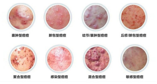 痘痘:主要为囊肿型痘痘、脓包型痘痘、聚合型痘痘、感染型痘痘等多种类型。